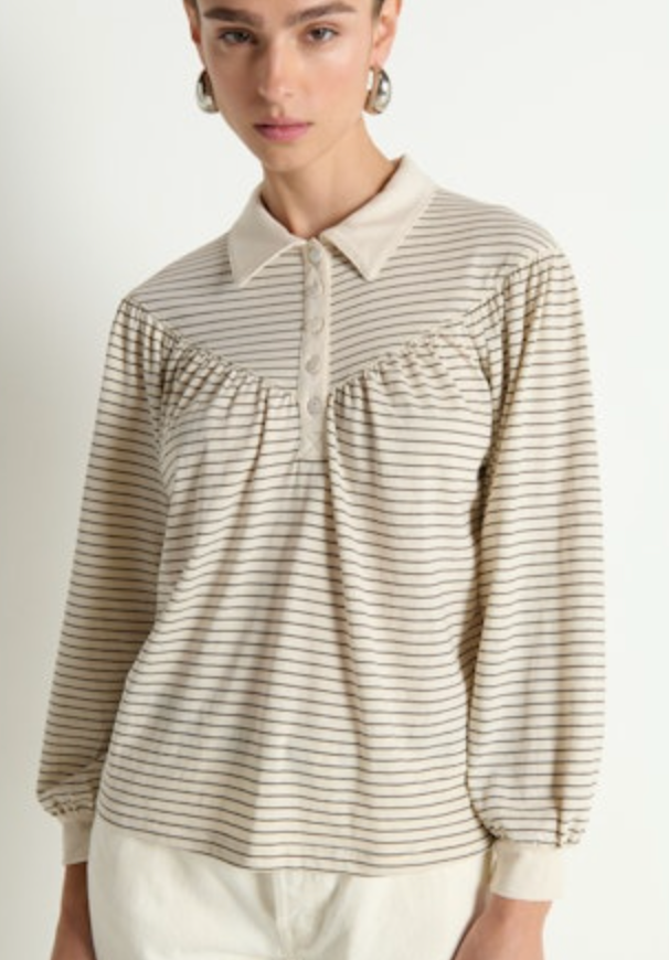 The Cecila Tee offers a feminine take on the polo. A collared neckline, shell buttons, and shirred cuffs add structure, while the easy 100% organic cotton drapes just right.