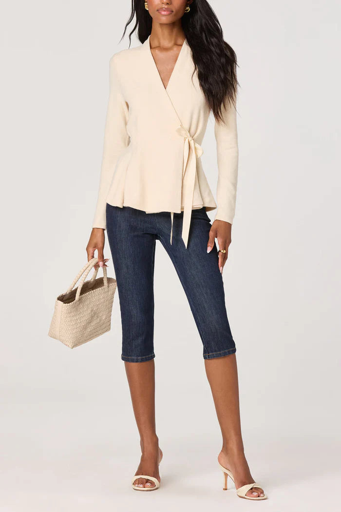 Soft vanilla wrap top with a flattering silhouette and versatile styling potential. The wrap construction offers adjustable fit and effortless elegance, making it an essential layering piece for any wardrobe.