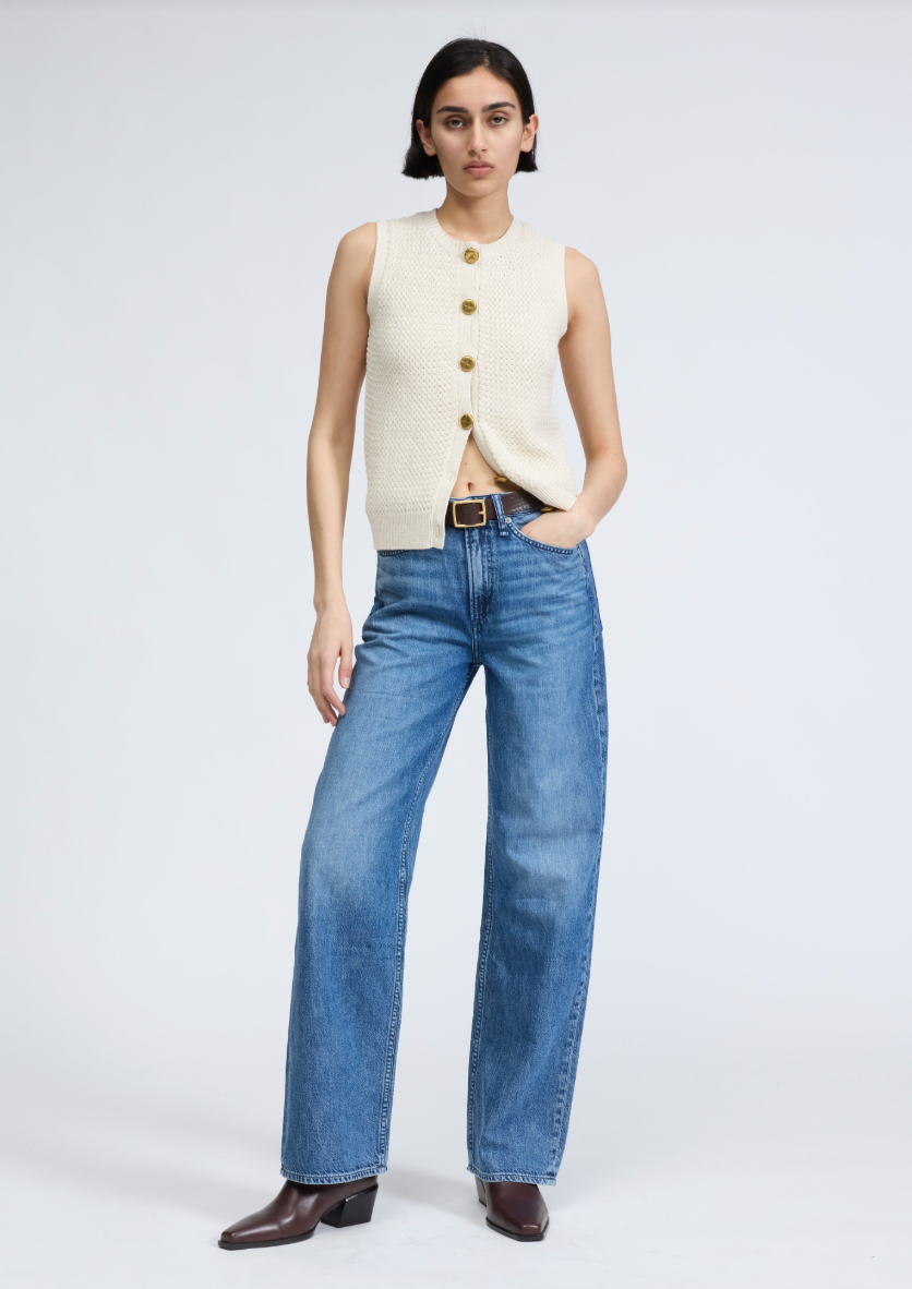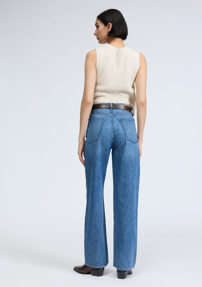 The Logan. Rag & Bone's laid-back, mid-rise jean with a roomy cut through the hip and thigh. Pro tip: take your natural size and wear low on your waist for a relaxed look or size down for a high-rise look. Crafted in Featherweight denim with a relaxed fit. In River, a medium indigo wash with a clean hem.