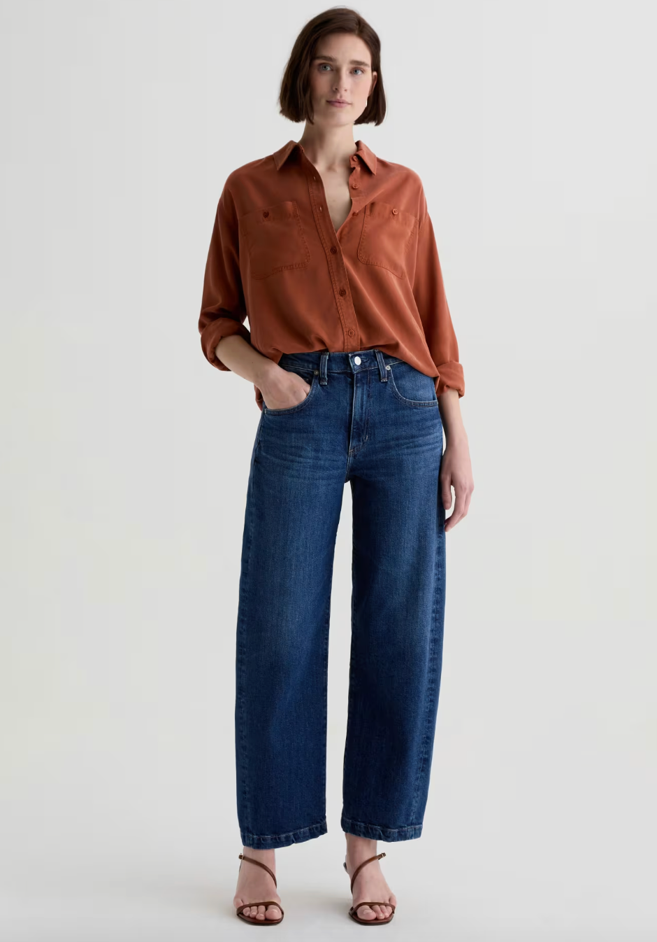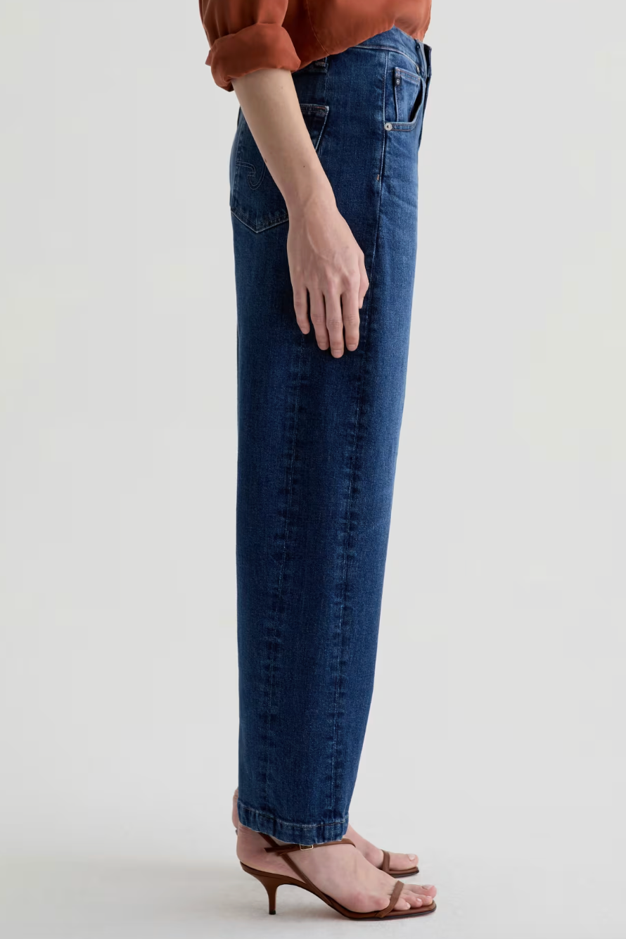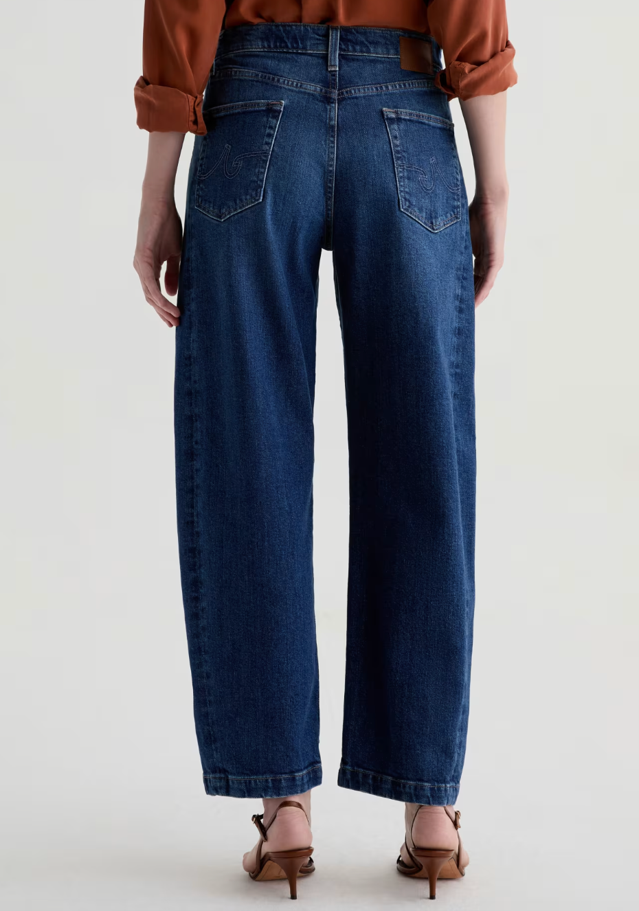 The Hattie in Vapor Wash is a high-rise barrel jean with a 28” inseam, crafted from 11 oz. Journey Denim with a comfort stretch feel. These jeans is crafted with AG's Vapor Wash technology. AG Vapor Wash process significantly reduces the use of water, chemicals, and energy to lessen environmental impact. Finished with a vegan and 100% biodegradable cellulose patch at the back waistband.
