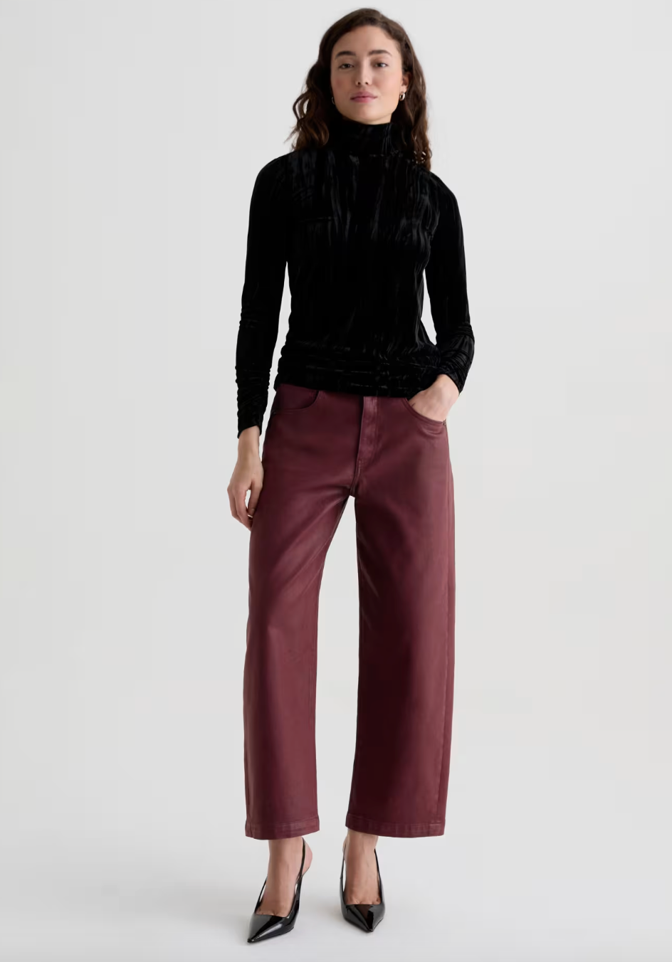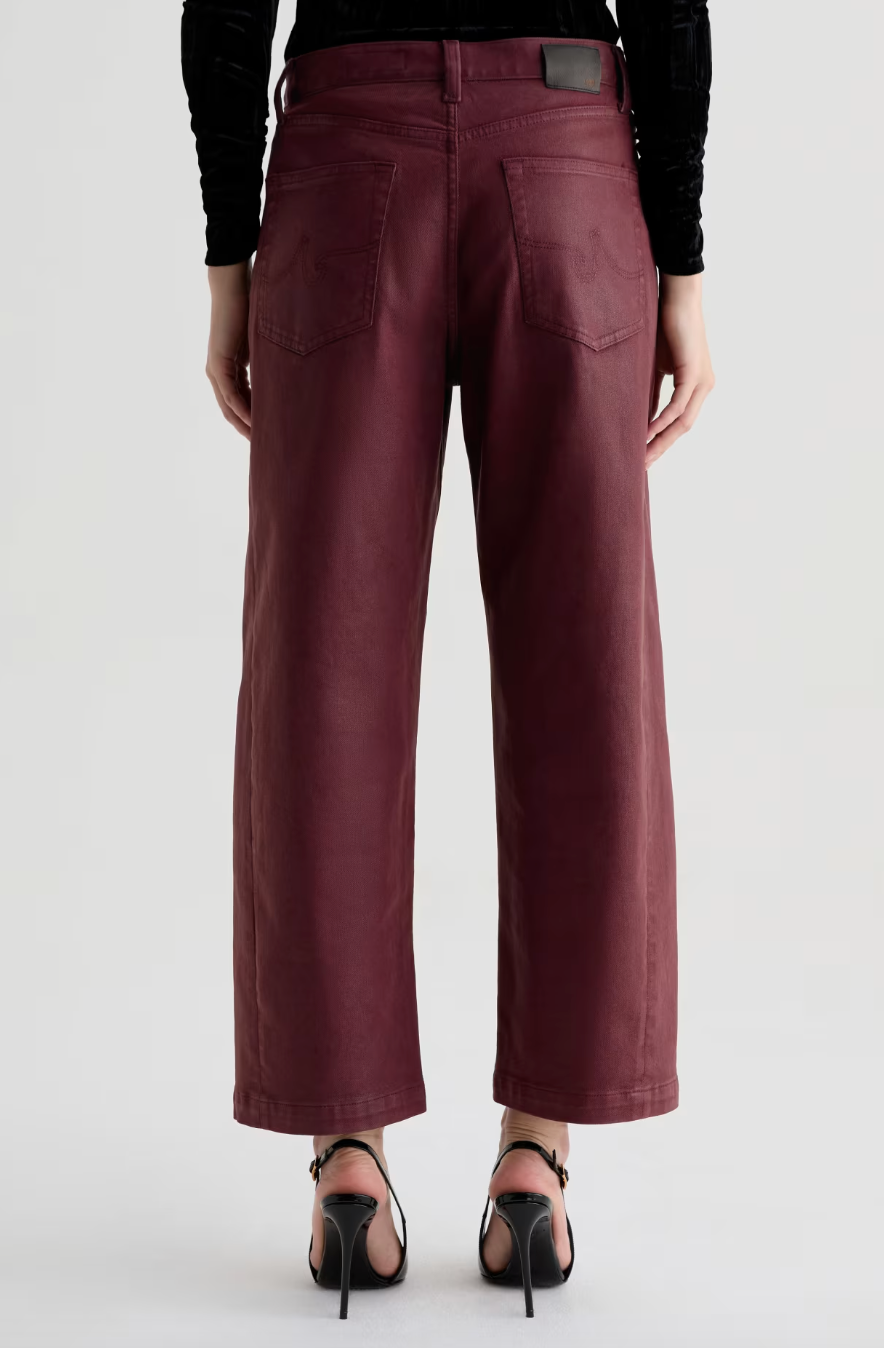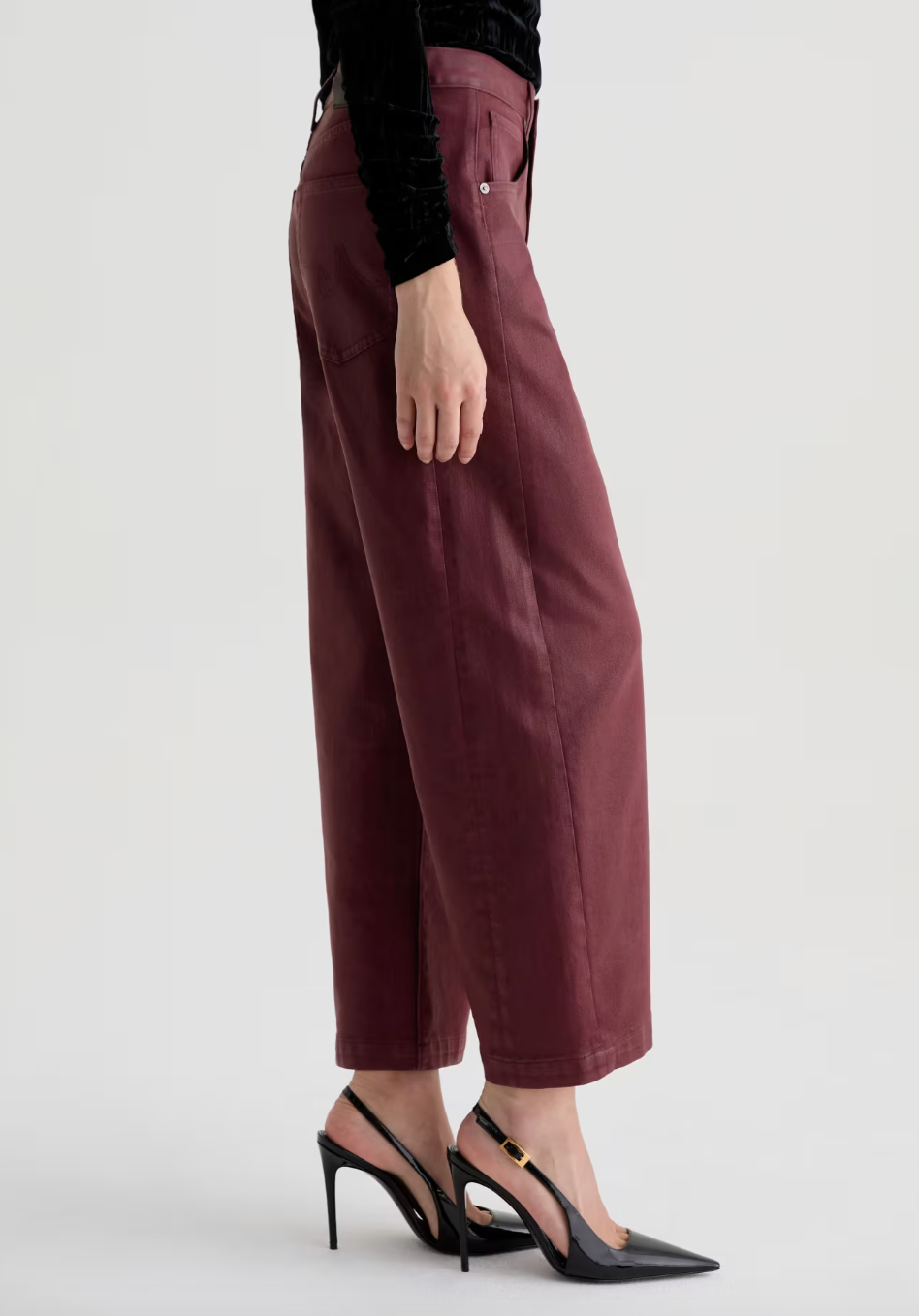 The Hattie Crop is a high-rise barrel jean with a cropped hem that hits just above the ankle for a modern, easy-to-style look. Designed with curved, voluminous legs that taper at the hem, this silhouette brings a fresh take on relaxed denim with a sheen coated finish that was hand-finished with an exclusive Leatherette process. Crafted from AG Cloud Soft Denim, it offers all-day comfort.