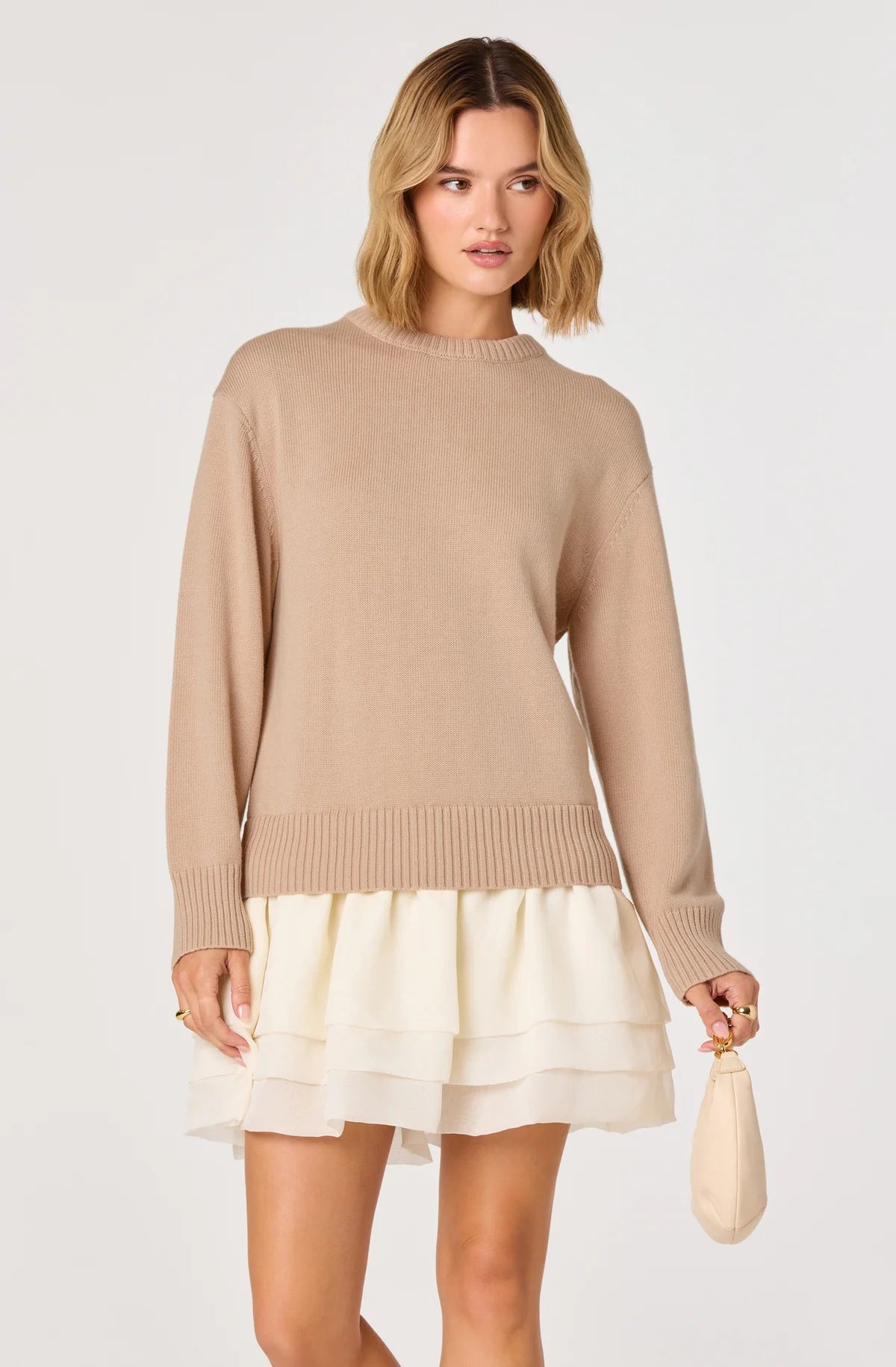 Faux layered mini dress, knit sweater top with ribbed neckline, cuffs, and hem