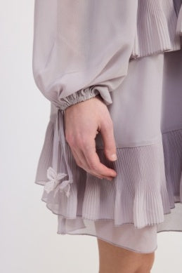 Long sleeve mini dress w/ a tiered skirt and tie cuffs