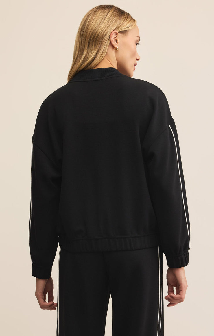 Laid-back and luxe, this bomber-style zip-up is made from ultra-soft jersey with contrast piping and patch pockets. Roomy, cozy, and built for layering.