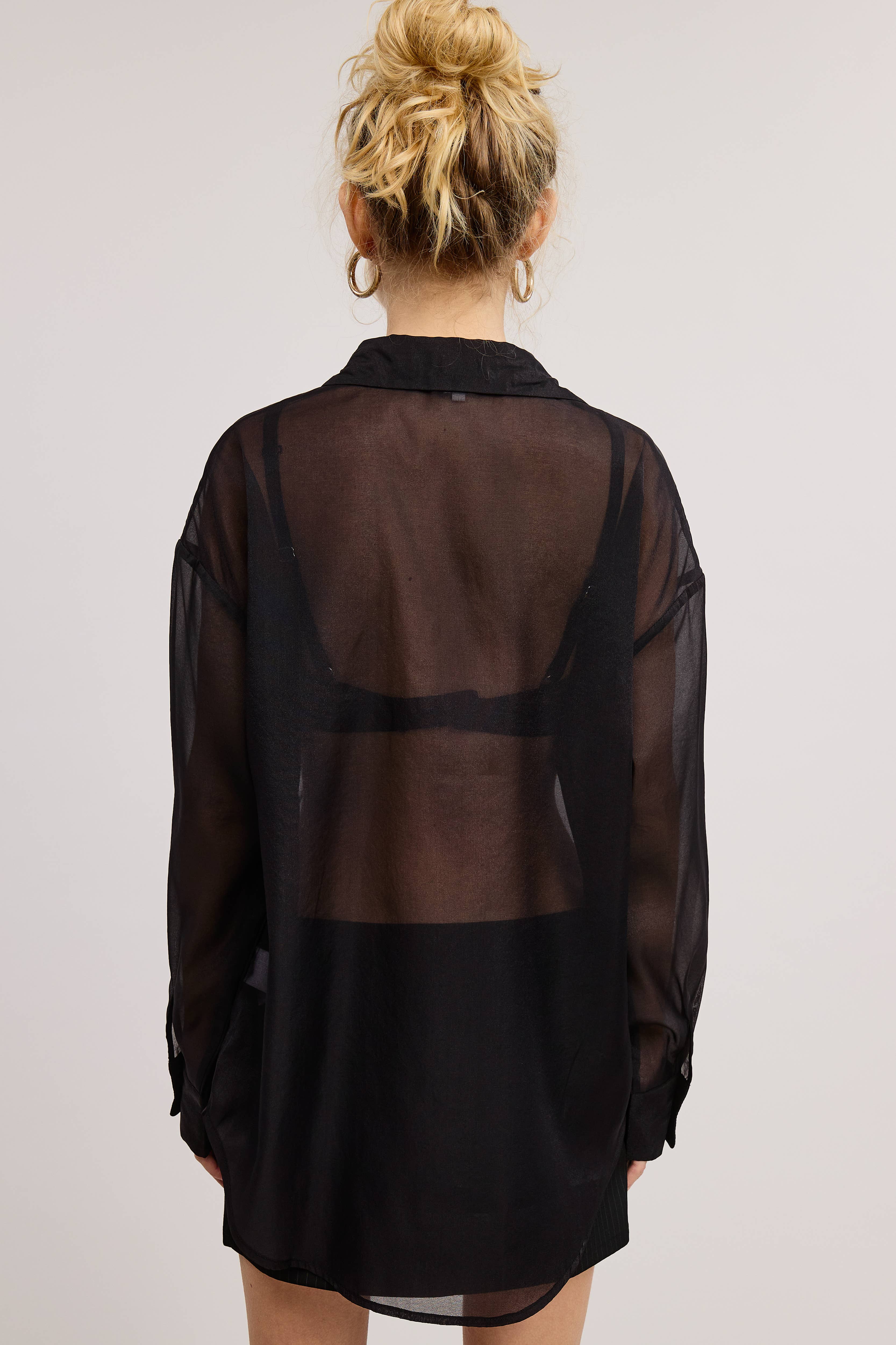 Pair with MB5109 for a coordinated look! A collared, oversized button-down shirt made from sheer Organza fabric. Designed with an all-over sheer look and a shirttail hem, the solid contrast collar and sleeve cuffs add a touch of sophisticated chic style.