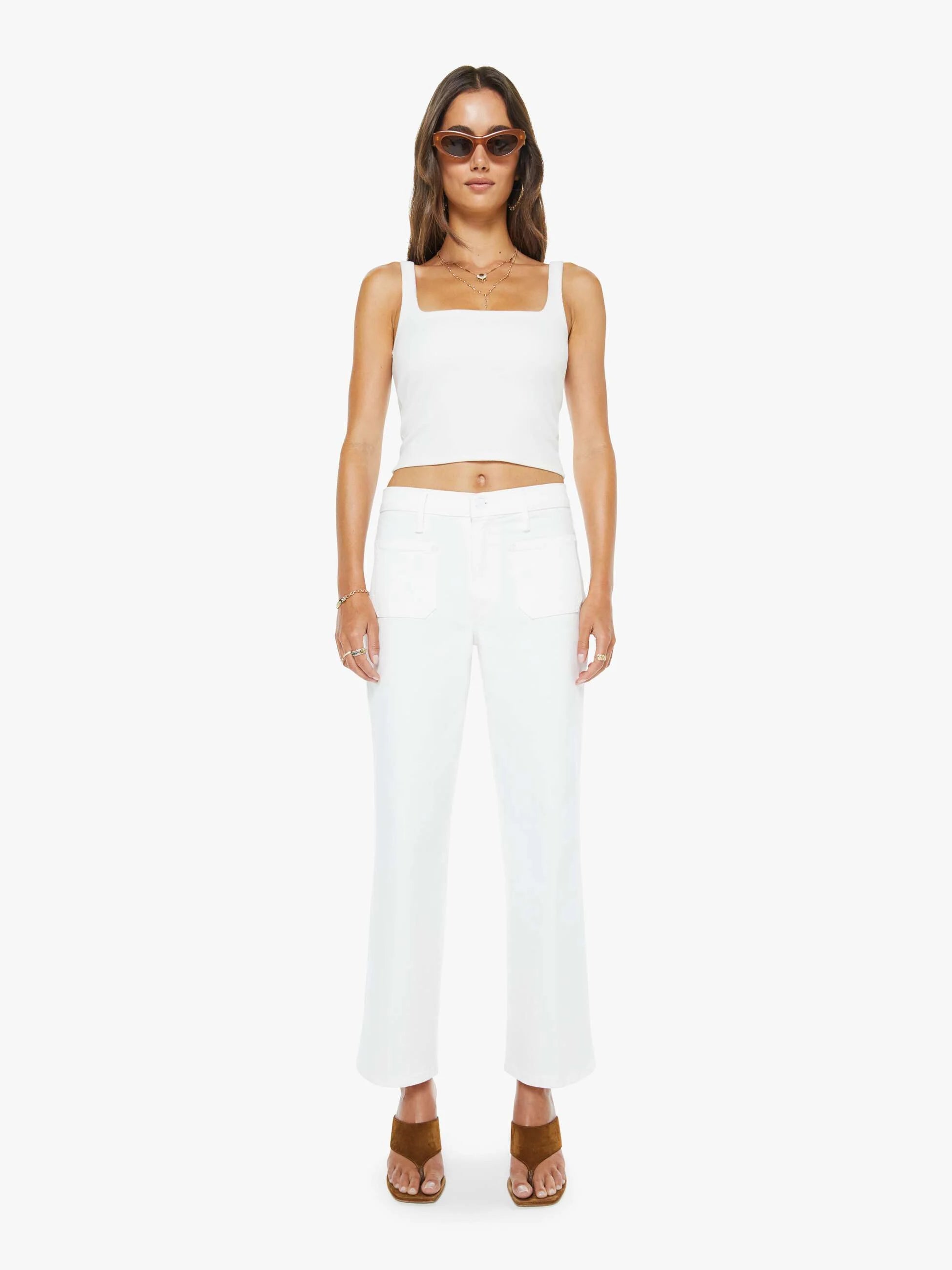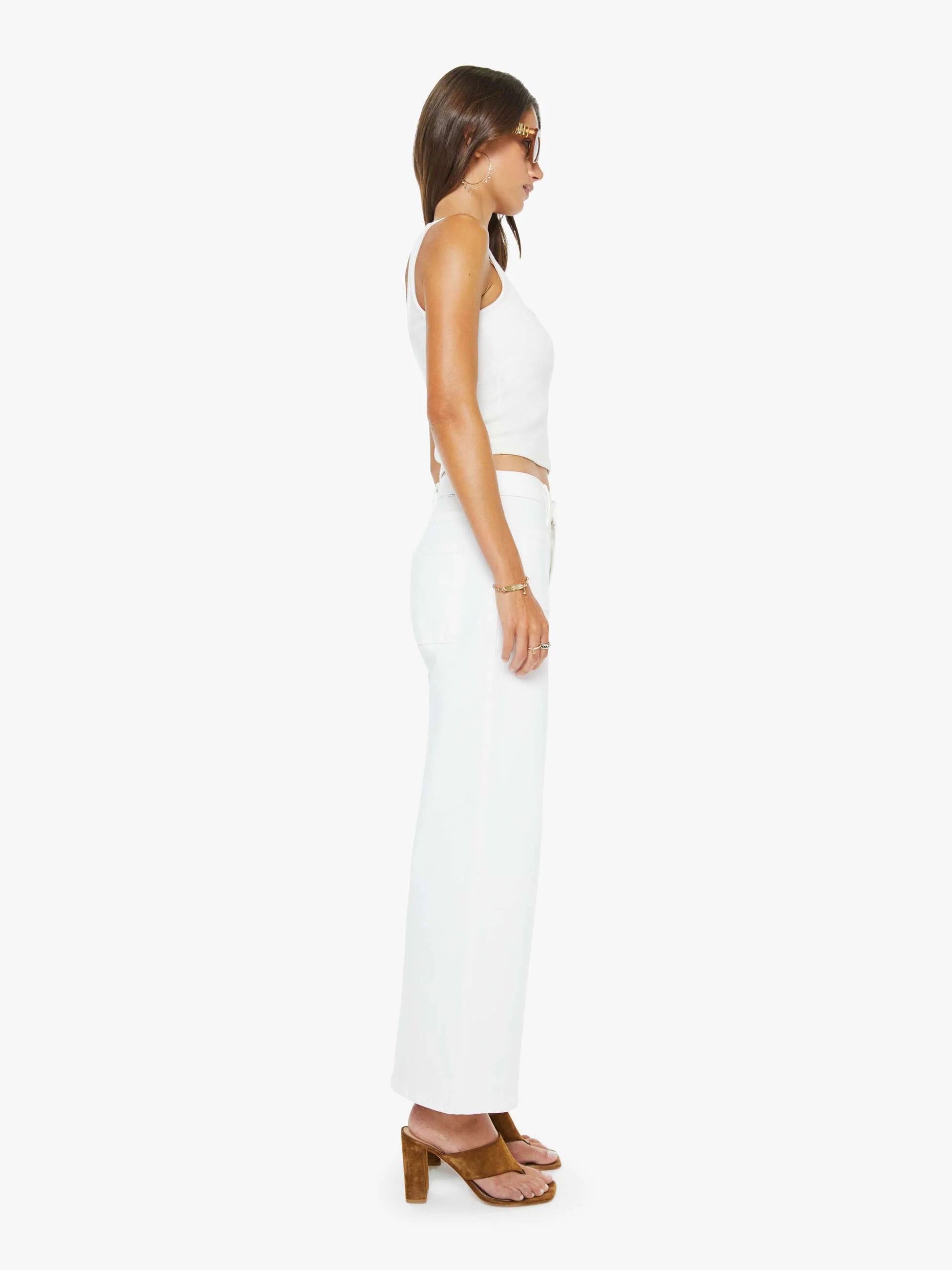 - MOTHER's in the clear. Mid-rise jeans with a loose fit, zip fly, wide leg, patch pockets and ankle-length inseam with a clean hem. Cut from semi-rigid SUPERIOR denim, Totally Innocent is a classic white with tonal hardware.