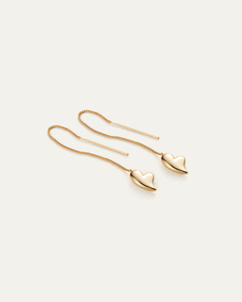 Tiny voluminous hearts are suspended on a barely-there chain, appearing like they're floating beneath your lobe. These versatile threader earrings can be looped into any piercing on your ear and adjusted to your preferred length. Finished in high-polish gold.
