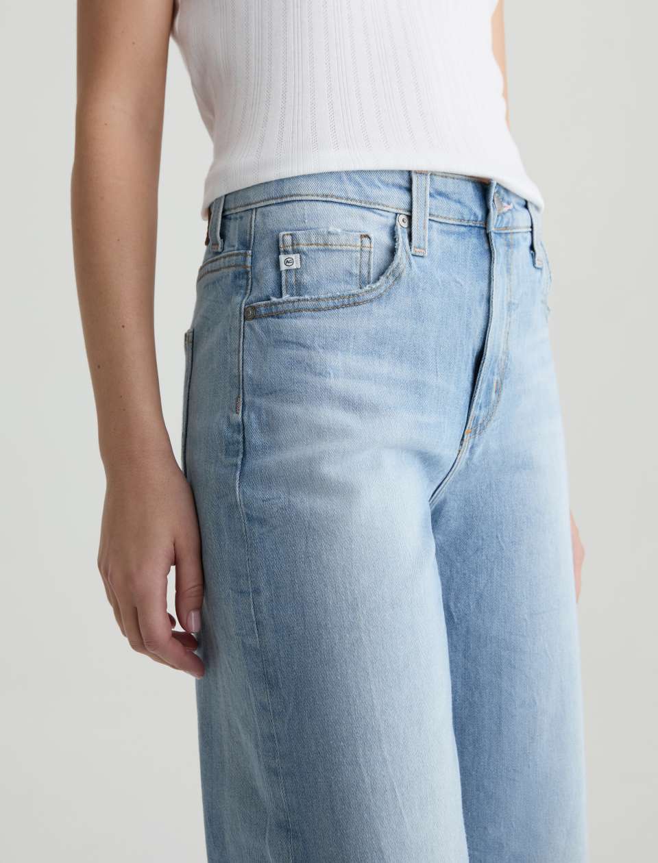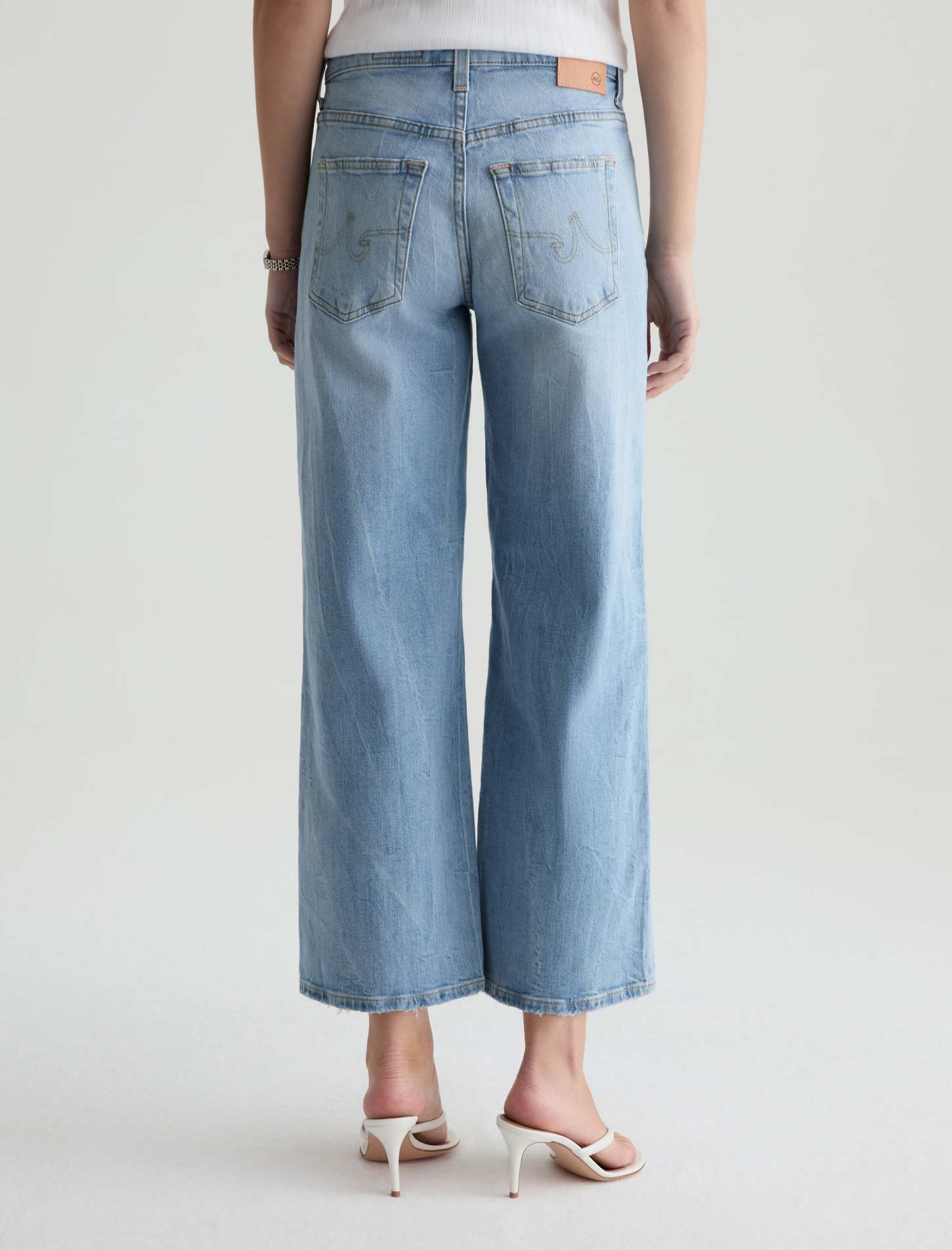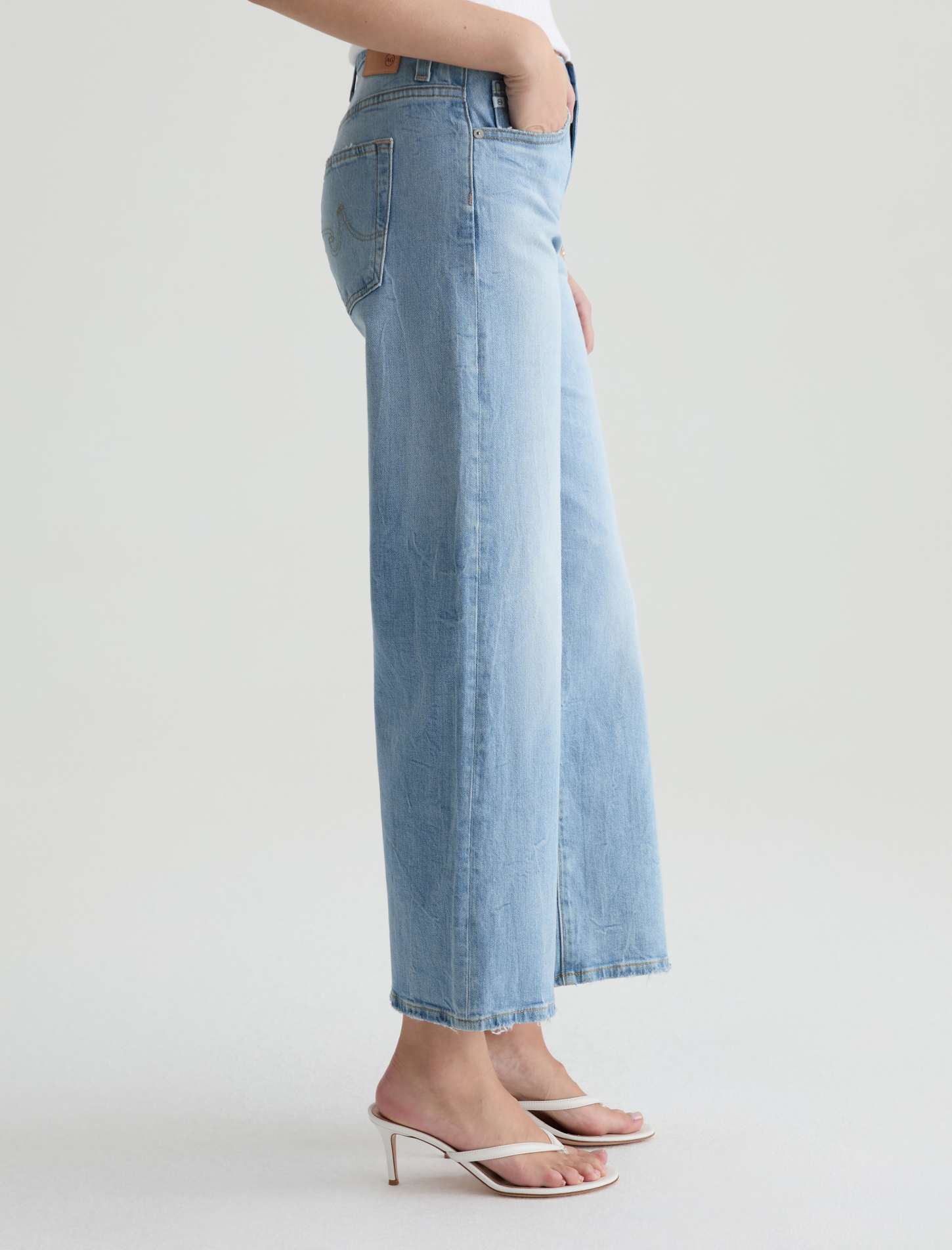 The Saige Wide Leg Crop is a mid-rise jean crafted from comfort stretch denim. Designed with a cropped wide-leg silhouette and finished with busted hems, it offers a relaxed fit with a lived-in, laid-back finish.