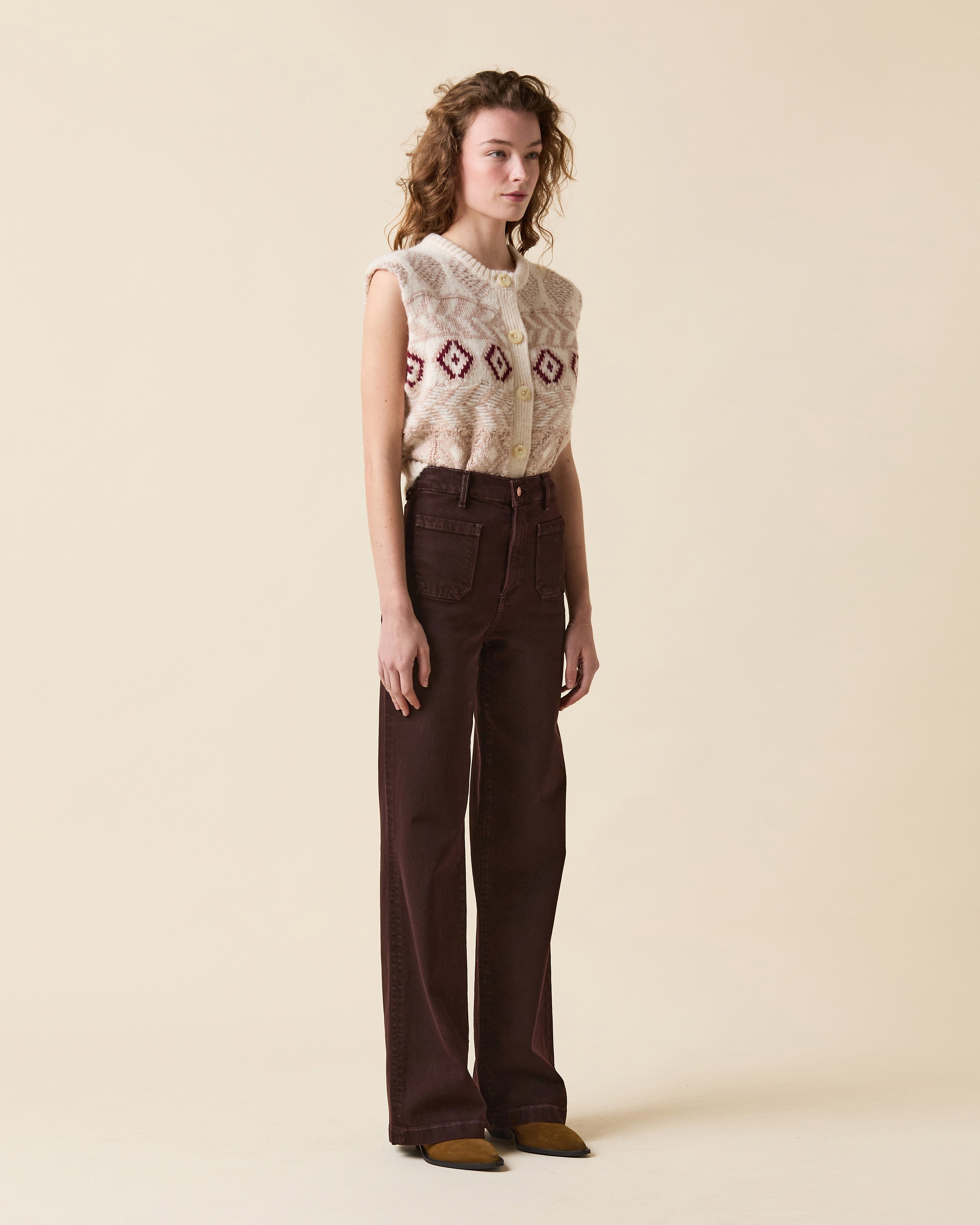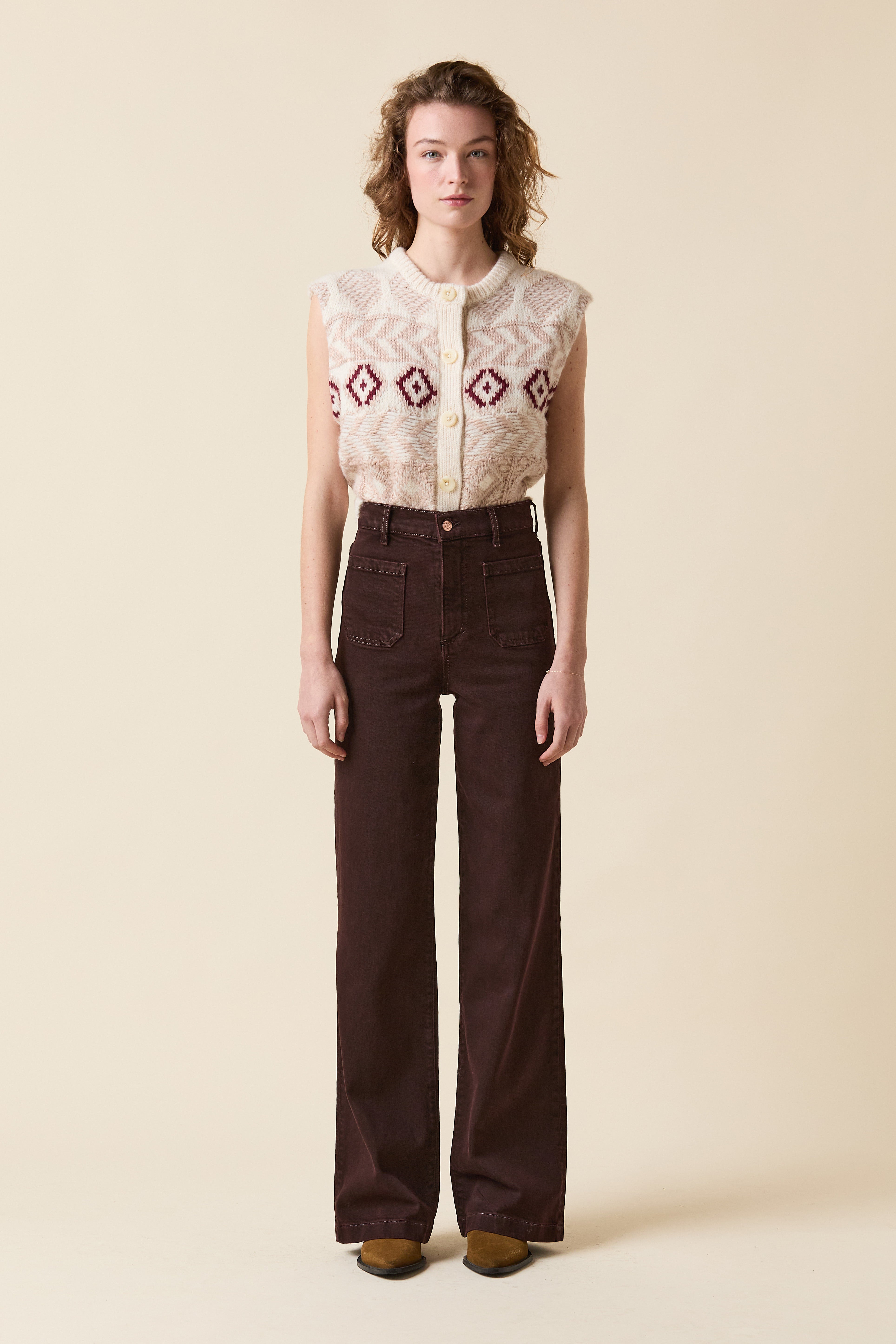 *Brown color denim *Button and concealed zipper fastening *Machine wash cold *98% Cotton / 2% Elastane